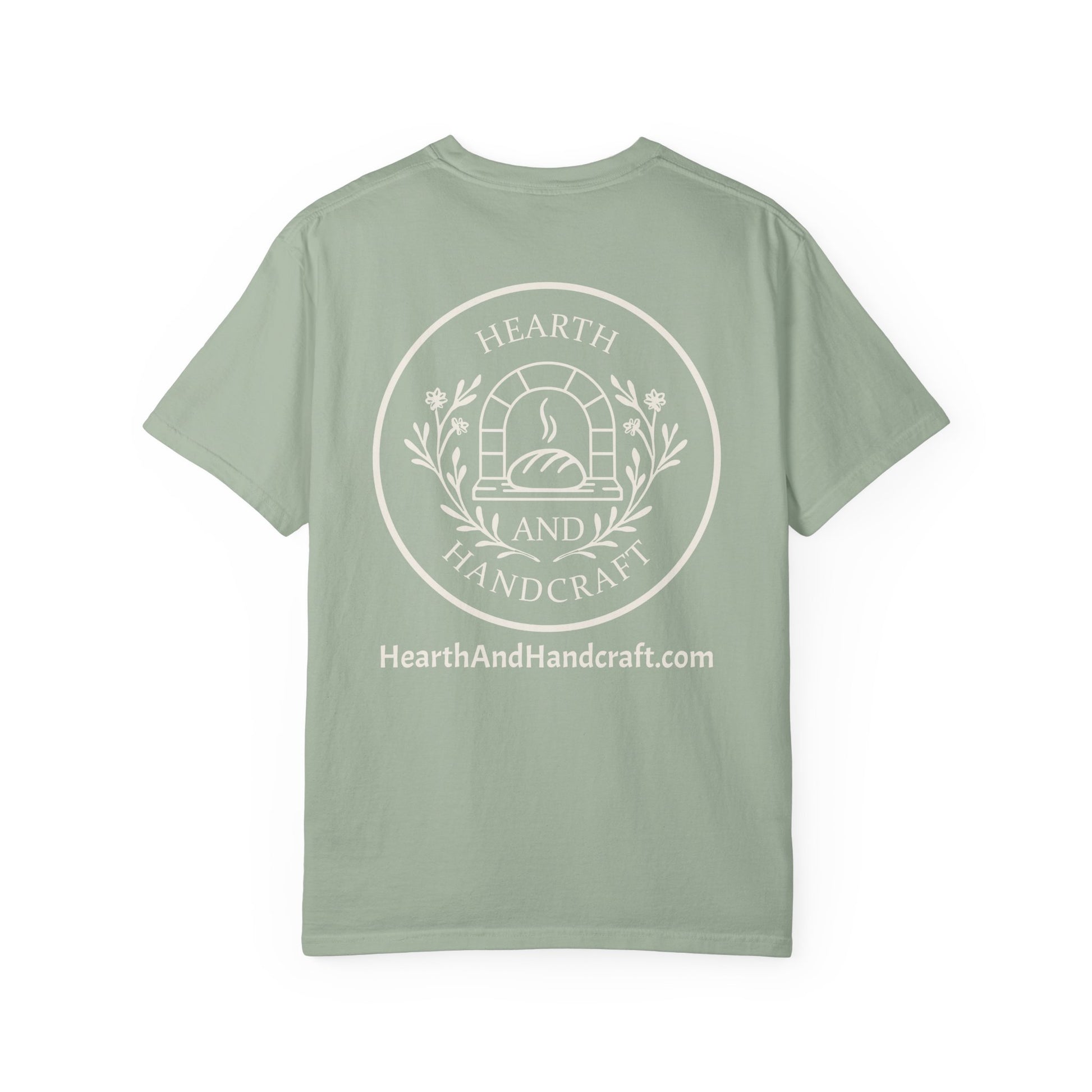 This garment-dyed tee carries a warm, homespun heart — soft to the touch and built to last. The front whisper-logo and the back’s circular “Hearth and Handcraft” emblem evoke a slow, hands-on life: wood-fired ovens, late-afternoon baking, and small-studio making. The heavyweight cotton and relaxed fit sit like a familiar friend against your shoulders. Wear it while tending a loaf, packing goods for the market, or layering under a chore jacket for a cool morning at the workshop. The muted, washed color and sewn-in label give it that lived-in, wearable look that ages beautifully with every wash.