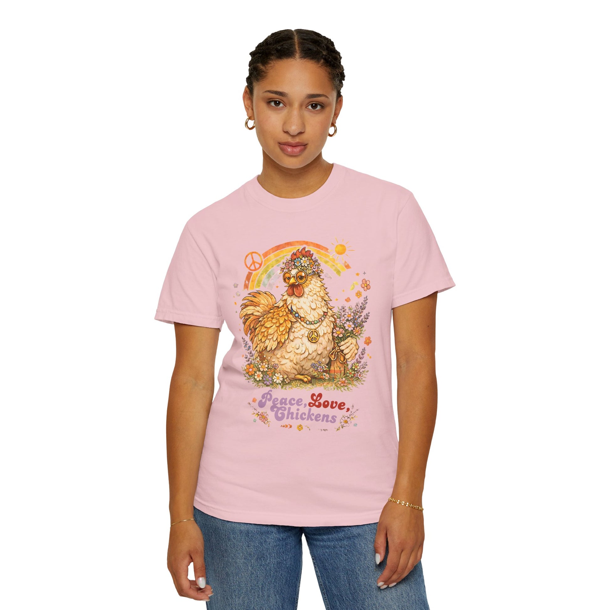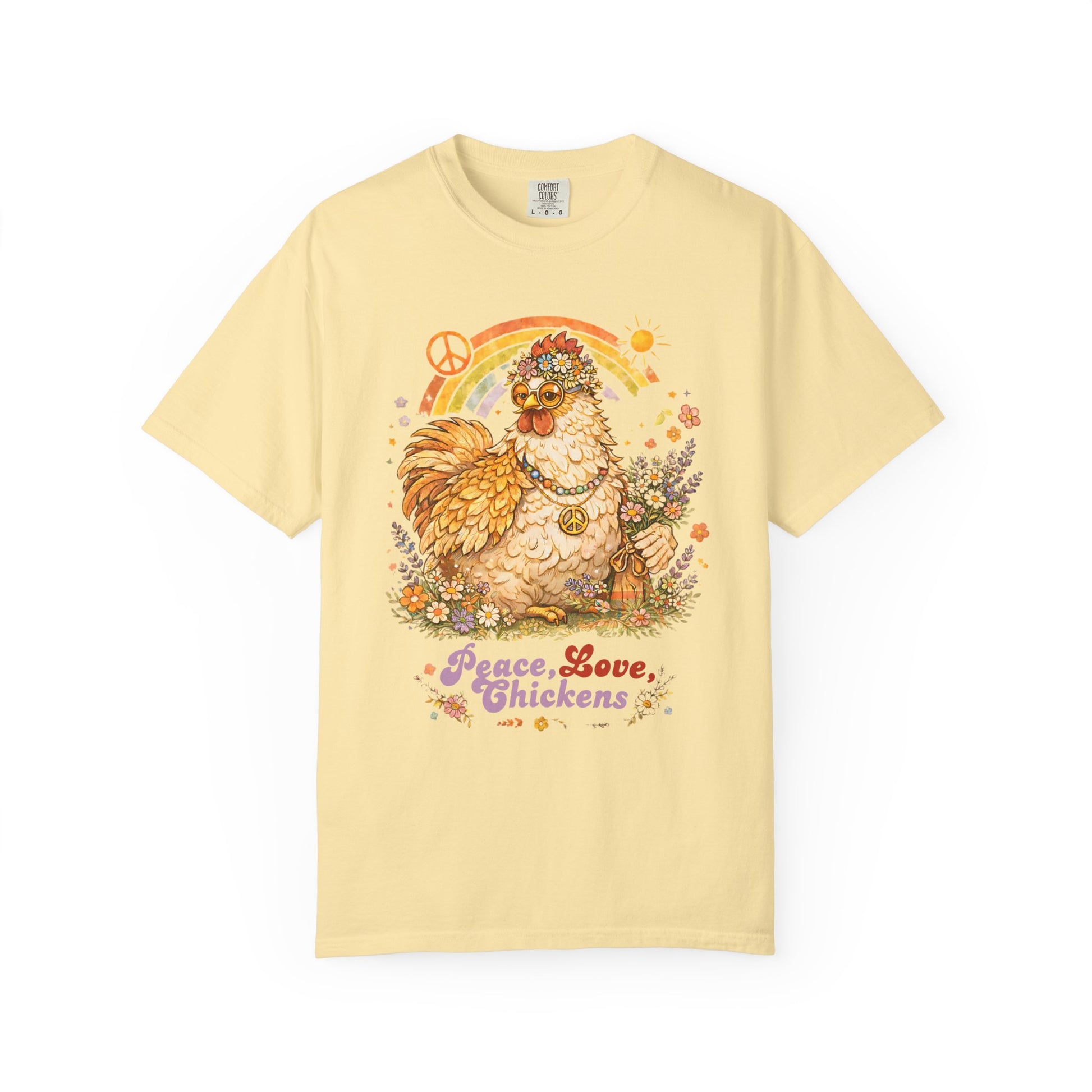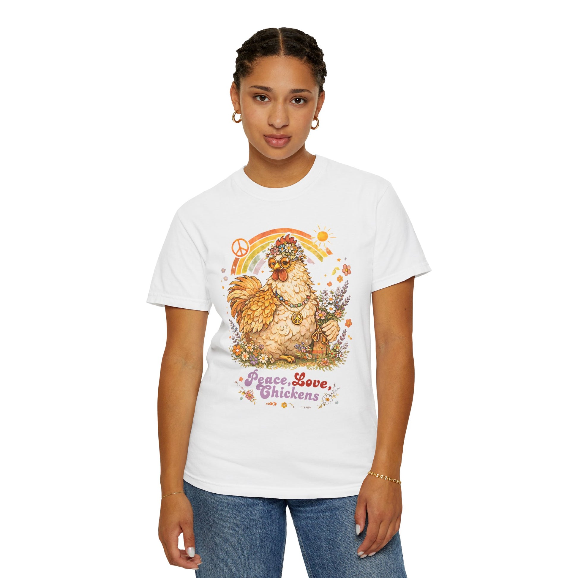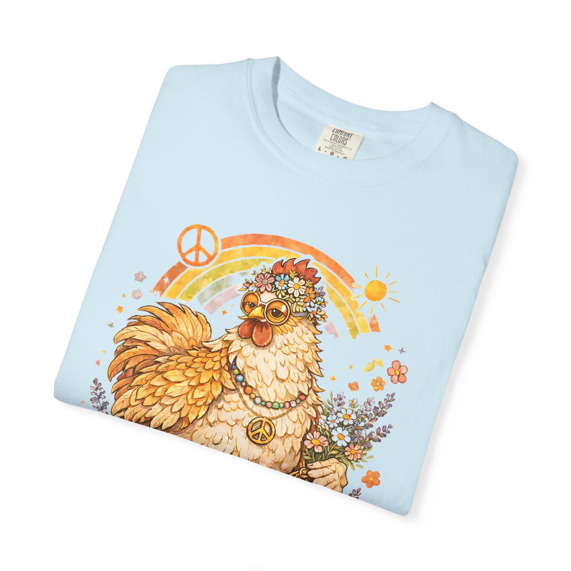 This tee channels a sunlit, 60s backyard — think loose petals, warm afternoons, and a laugh shared over fresh eggs. A hand-drawn flower-child hen nestles among daisy swirls with the playful slogan “peace, love, chickens.” It’s the kind of shirt you reach for when you want comfort and character: soft, lived-in color, relaxed drape, and that gentle vintage vibe that makes everyday moments feel a little more peaceful. Wear it while gathering eggs at dawn, sipping coffee on the porch, or wandering a farmers’ market — it speaks to people who love slow mornings, backyard homesteading, and a bit of retro charm.